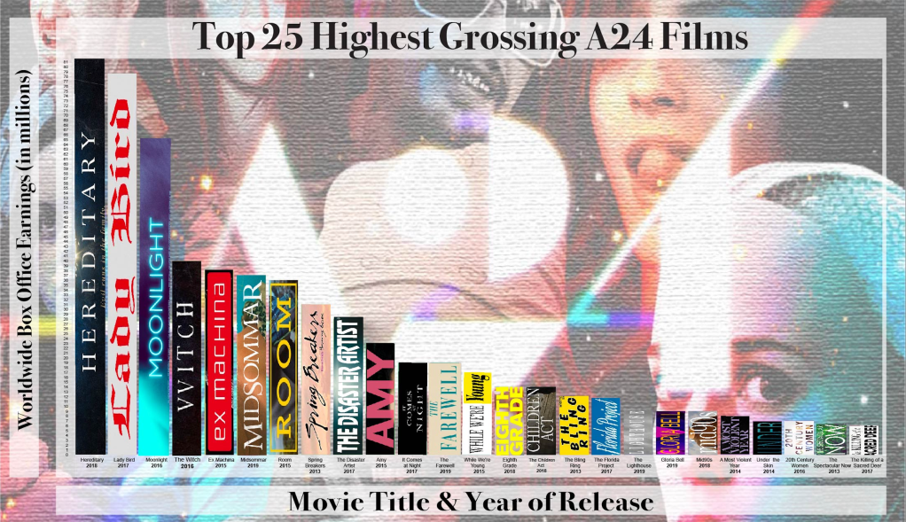 The background is a collage from various films that A24 has released, anchored together by the studio’s logo in the middle. I chose to use this image because it did not focus on one particular film in the way that the graph did, but rather encompassed a number of A24 projects, and provided a more immediate context when first viewing the graph. If one does not wish to analyze the numbers in the graph, they will at the very least understand what the information is about.
